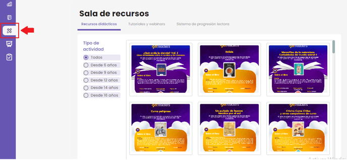 La sala de recursos cuenta con 3 subdivisiones: Recursos didácticos, Tutoriales y webinars y nuestro Sistema de progresión lectora. Te contamos qué encontrarás en cada una de ellas: